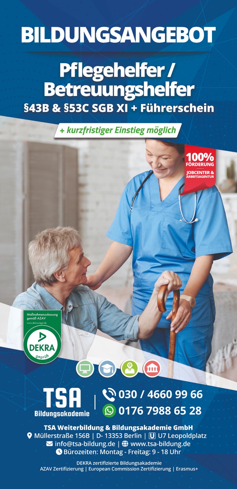 Unsere anerkannte Weiterbildung bereitet Sie gezielt auf die Betreuung und Aktivierung von Senioren und Pflegebedürftigen vor. In nur 4,5 Monaten erhalten Sie praxisnahes Fachwissen, Kommunikationstraining und rechtliche Grundlagen.<br/><br/> Inklusive Erste-Hilfe-Kurs & Führerscheinförderung (über Jobcenter möglich).<br/><br/> ✅ Staatlich anerkannt<br/> ✅ Voll förderfähig mit Bildungsgutschein<br/> ✅ Jobgarantie bei erfolgreichem Abschluss<br/>