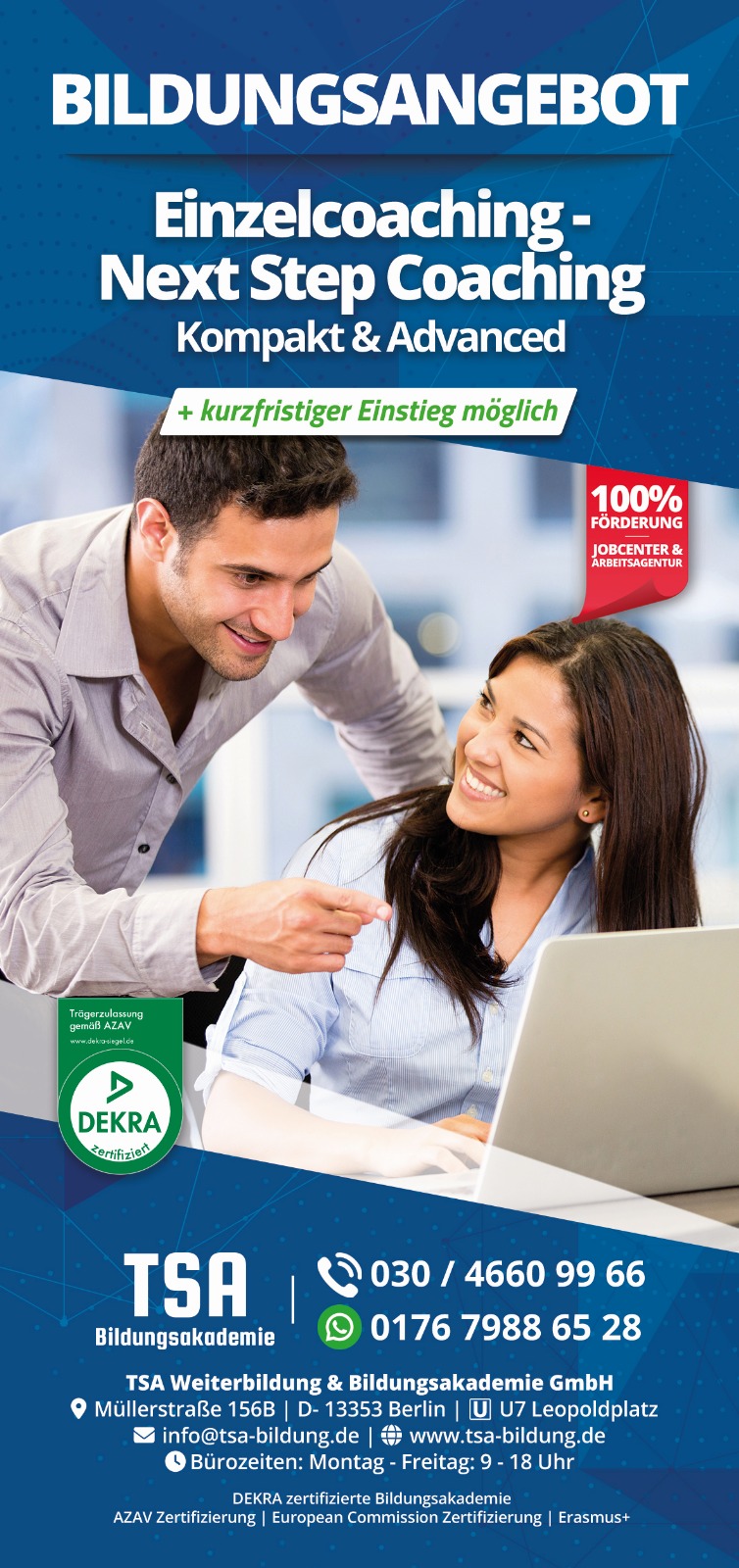 Next Step Coaching – Individuelles Einzelcoaching (AZAV-zertifiziert) Das „Next Step Coaching“ ist eine nach AZAV zertifizierte Maßnahme gemäß § 45 SGB III zur Aktivierung und beruflichen Eingliederung. Im Rahmen eines individuellen Einzelcoachings (160 Unterrichtseinheiten) erhalten Teilnehmende professionelle Unterstützung bei der beruflichen Neuorientierung, Bewerbungserstellung, Kommunikationsstärkung und Motivationsförderung. Die Maßnahme ist zu 100 % förderfähig über einen Bildungsgutschein der Agentur für Arbeit oder des Jobcenters. Die Durchführung erfolgt in Präsenz, online oder hybrid am Standort Müllerstraße 156 b, 13353 Berlin. Das erweiterte Einzelcoaching bietet eine intensive und persönliche Begleitung für Ihre berufliche Entwicklung mit umfassenden, praxisorientierten Inhalten. Es richtet sich an Personen, die vertiefte Unterstützung bei der Jobsuche, Bewerbung und persönlichen Weiterentwicklung benötigen. Durch den individuellen Ansatz und eine flexible Zeiteinteilung können Teilnehmende ihre beruflichen Ziele effizient und nachhaltig erreichen.