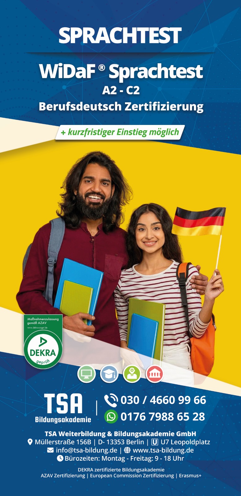 The WiDaF® Standard Language Test is a recognized and standardized German language test for professional purposes, assessing workplace-related German skills at levels A2 to C2. It is designed for professionals, advanced learners, and career starters who want to officially prove their German proficiency in a business or professional context – ideal for job applications, employment, further education, or participation in government-funded training programs in Berlin. The test is conducted entirely in multiple-choice format – with no oral or written components – and takes approximately 90 to 120 minutes. Upon completion, you will receive an official WiDaF® certificate with a score (0–990) and corresponding language level according to the Common European Framework of Reference for Languages (CEFR).