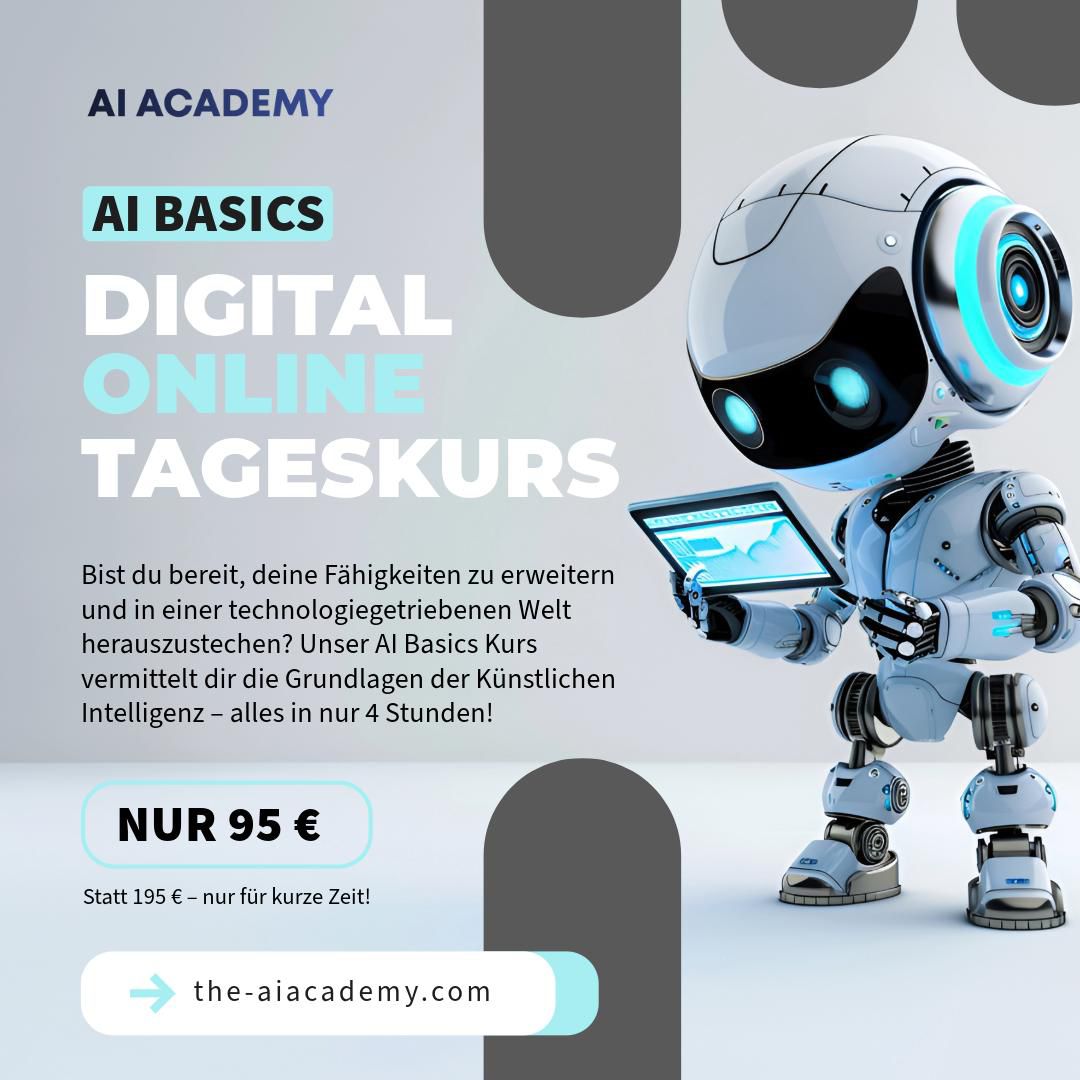Entdecken Sie die faszinierende Welt der Künstlichen Intelligenz in diesem kompakten Online-Kurs.<br/> In nur 4 Stunden lernen Sie die wichtigsten Grundlagen der KI kennen und wie Sie diese praktisch anwenden können.<br/> Erleben Sie praxisnahe Tools und erfahren Sie, wie Sie KI direkt im Alltag und Beruf nutzen können - ganz ohne Vorkenntnisse.
