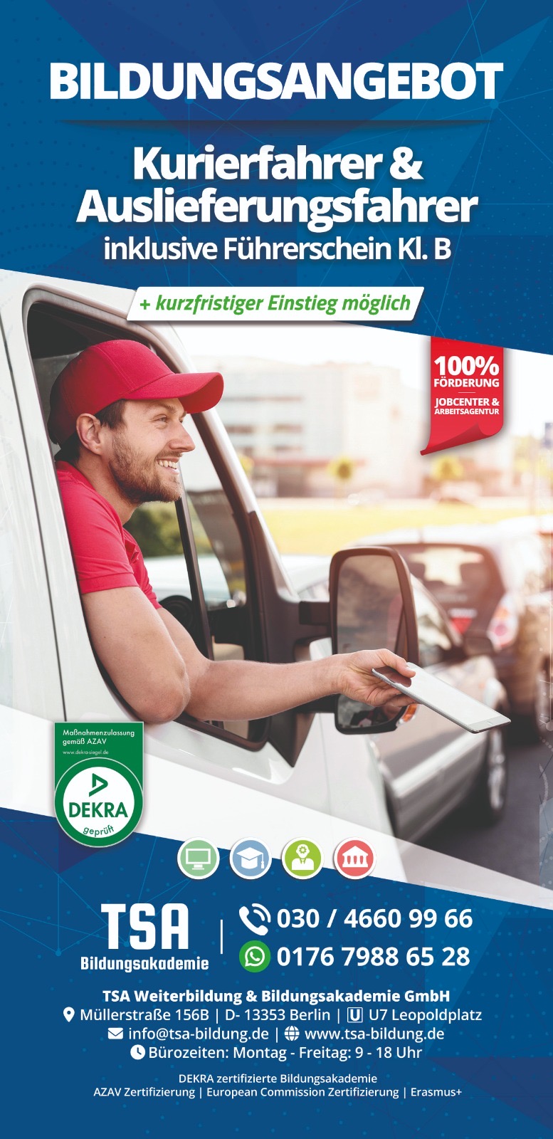 KURIERFAHRER-, BOTEN- UND AUSLIEFERUNGSFAHRER MIT ERWERB DES FÜHRERSCHEIN KLASSE B - WEITERBILDUNG BERLIN